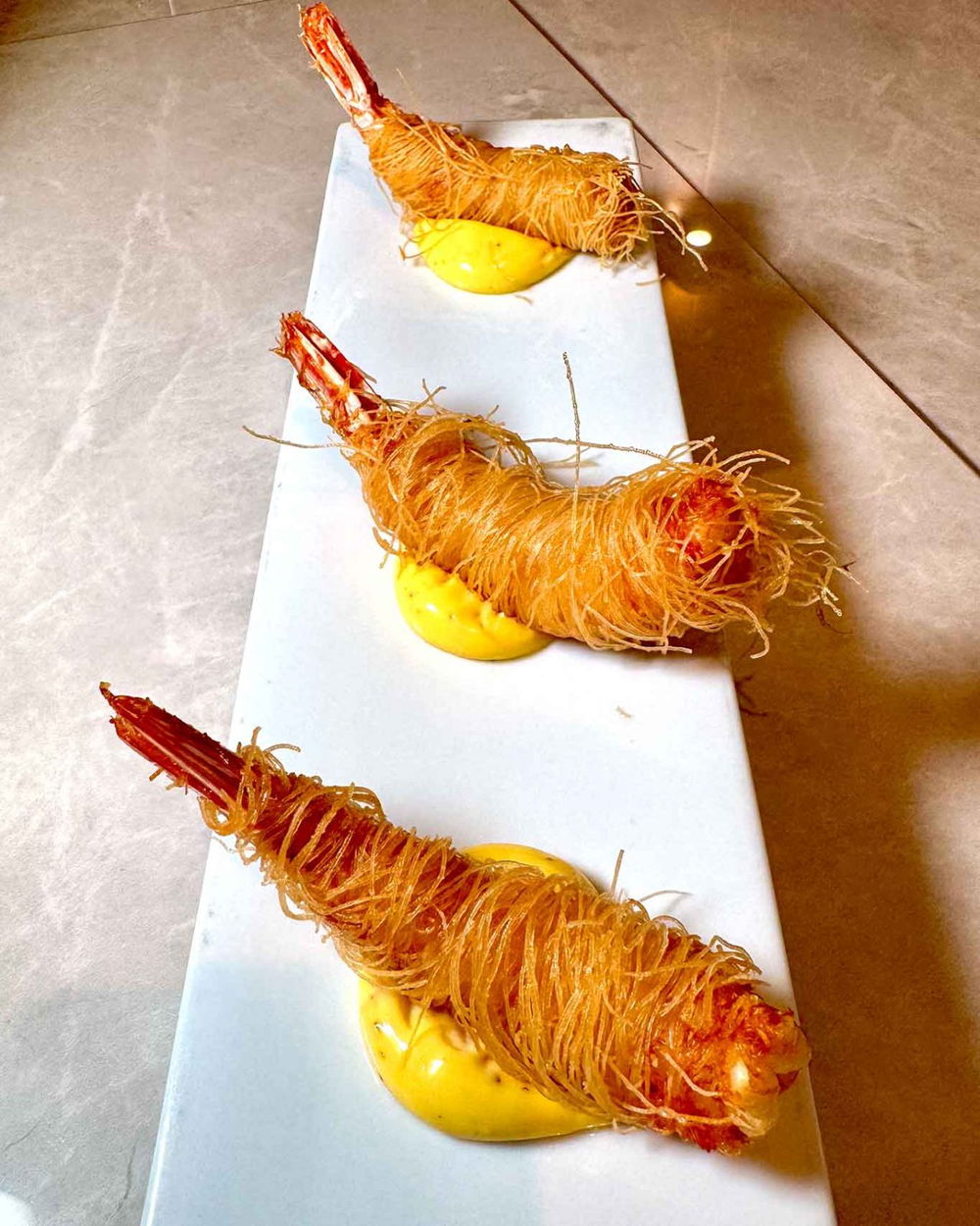 Intermezzo con i gamberi resi croccanti dalla pasta fillo e si passa ai primi piatti.