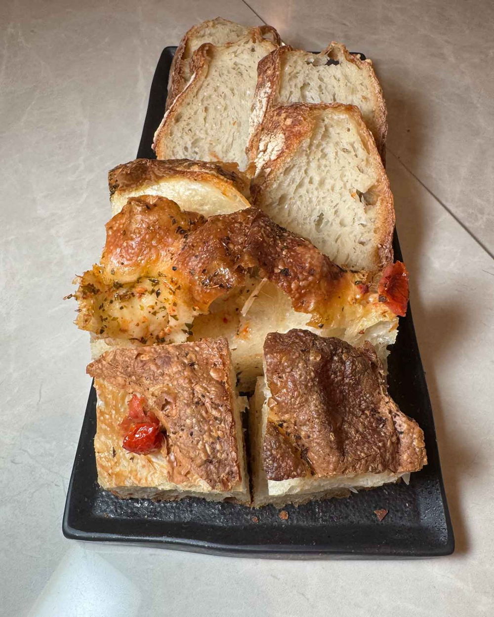 Una focaccia da condividere con entusiasmo rinforzata dal pane sempre fatto in casa. Servito con olio extra vergine di oliva dell’Abruzzo.
