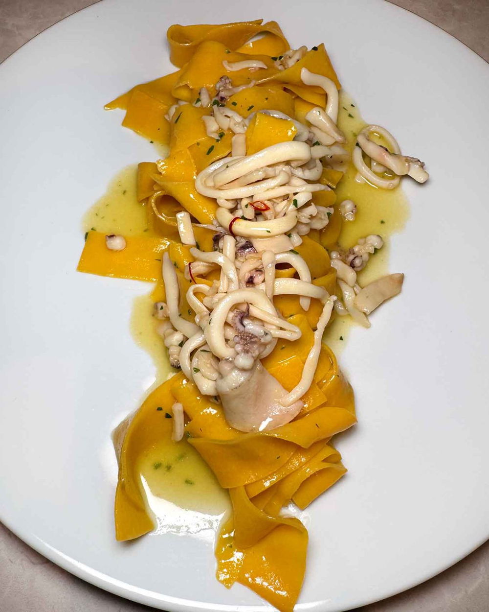 Delicate e ben eseguite le pappardelle con i calamari e pistilli di zafferano (25 euro). Un piatto comunque generoso.