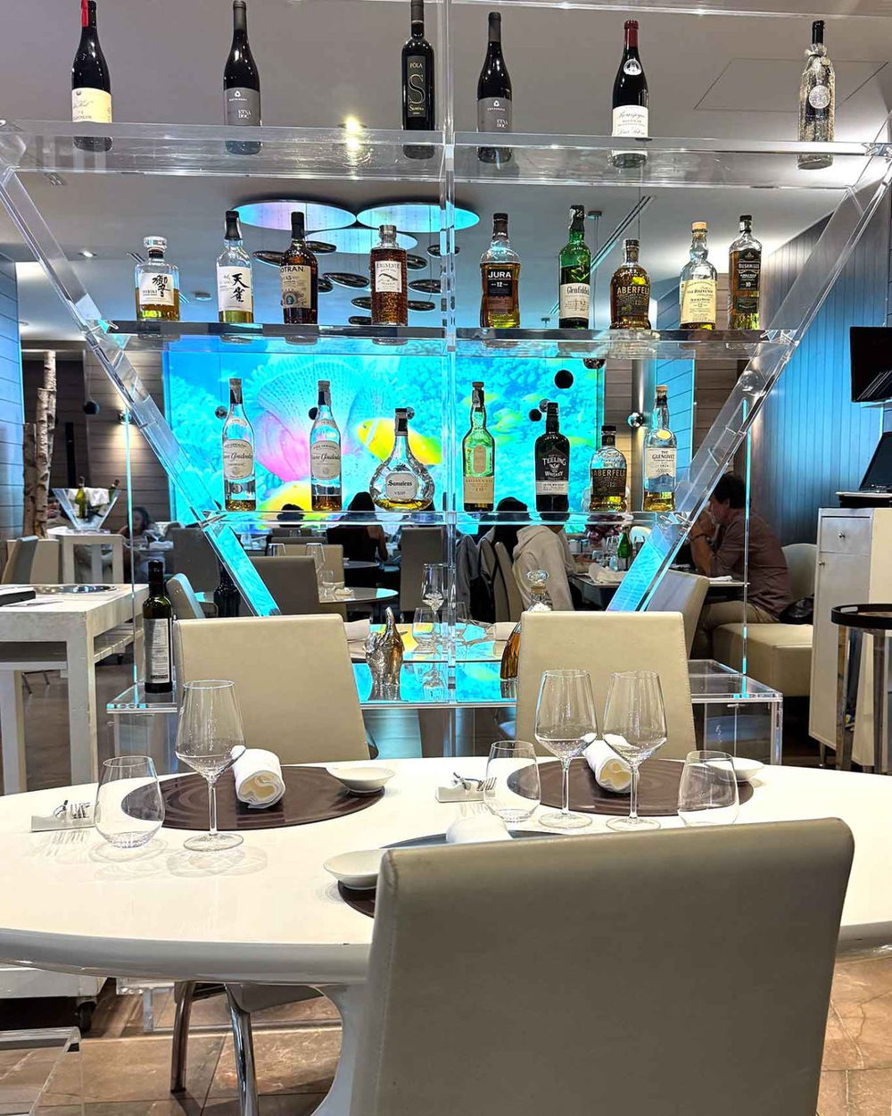 Ai toni del tortora e del greige, che hanno dominato il design dei locali più recenti, si impongono i cristalli, i tavoli laccati bianchi e l’azzurro di un enorme schermo retroilluminato sullo sfondo con la foto di una barriera corallina.