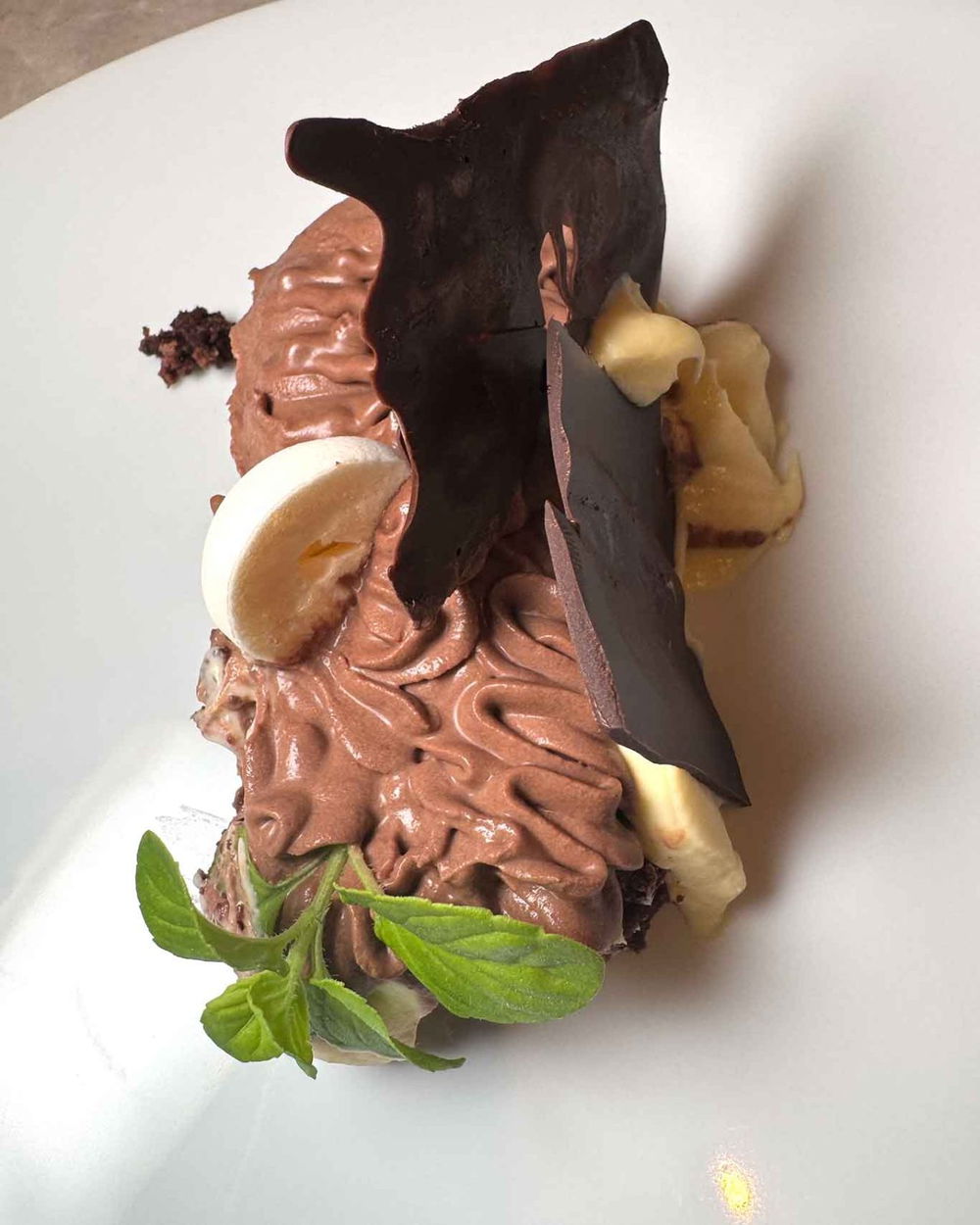 Cefalo con funghi, fegatini di pollo in patè, fondo di aglio nero e caffp (28 €)