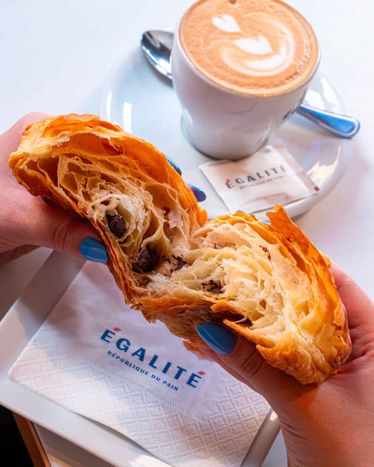 Ma veniamo all’offerta. Da Égalité si va per fragranti pain au chocolat (1,50 euro), burrose madeleine (2 €), tarte au sucre (1,50 €), tartellette varie (da 5 €) e cannelé bordelais aromatizzati (2,20 €). Tra le novità spicca il roll croissant, proposto in due versioni: al pistacchio e al cioccolato, entrambi ricoperti di granella (3 €).