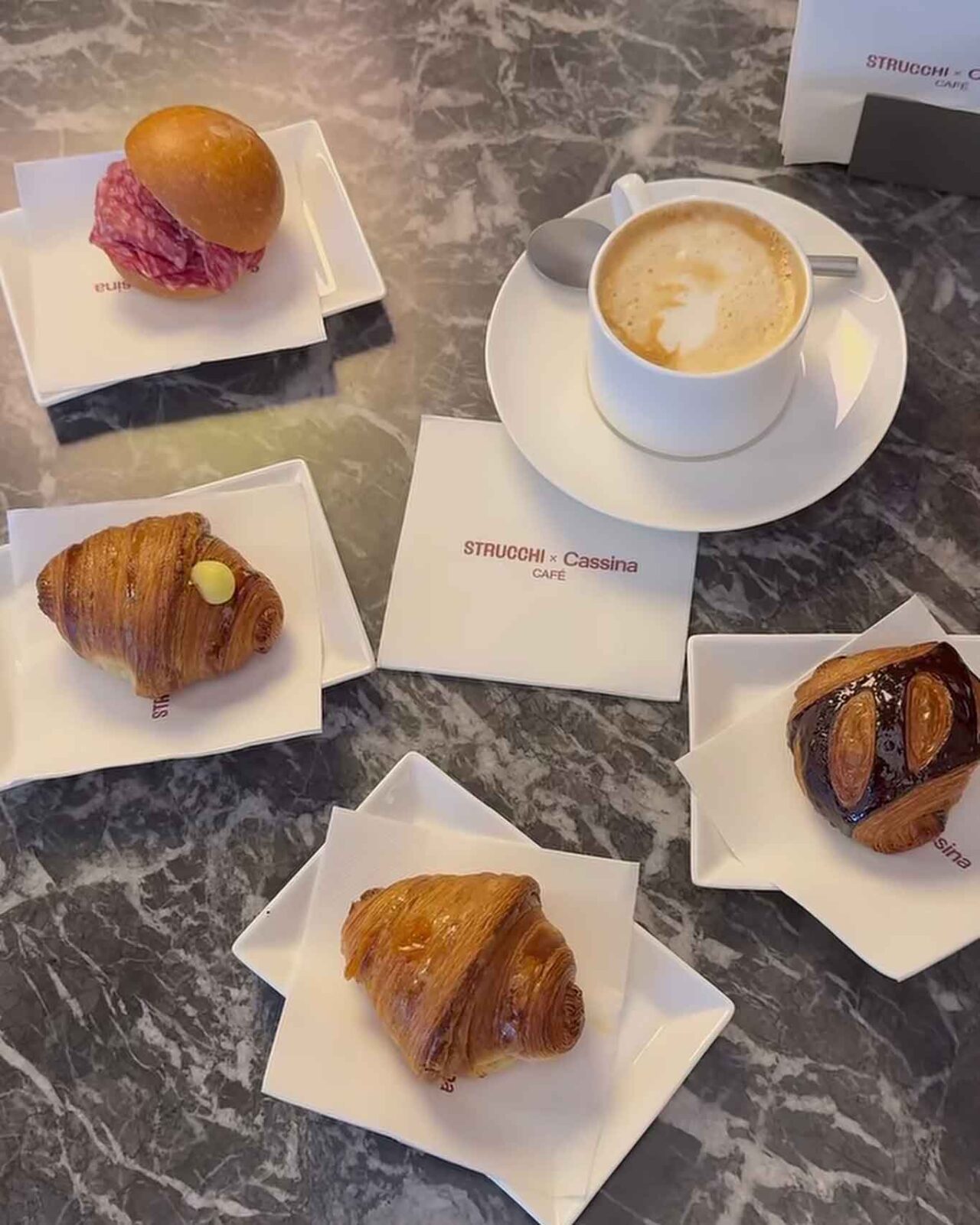 La giornata al Café inizia alle 7,30 con gli sfogliati del monzese Forno del Mastro, farciti al momento con con creme, gianduia e confetture di Colzani, ma anche pac e bun al cardamomo (4-6€). Punto forte della colazione salata sono i toast, proposti in tre versioni: classico con fontina e cotto Capitelli, vegano e il “Toast alla maniera di Strucchi” con giardiniera e pasta d’acciughe (da 10€).