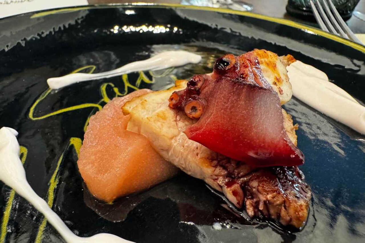 Pancia di maiale, polpo scottato, mousse di mele, riduzione di Aglianico – neanche male, ma secondo me maiale e polpo non avevano motivo per stare assieme.