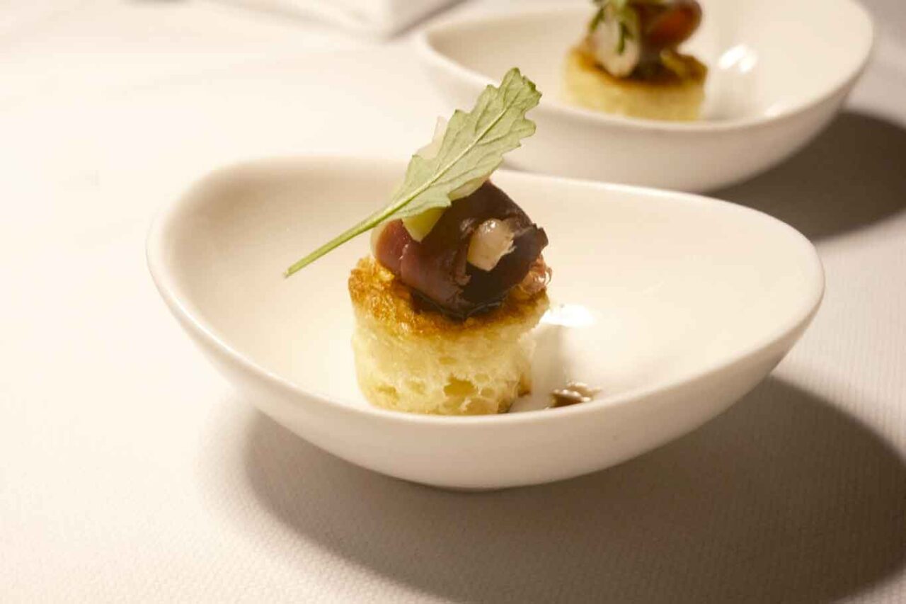 Per preparare la bocca arriva un piccolo pan brioche spennellato con aceto balsamico, speck e carciofo. L’attacco è acido, pensato per far salivare, mentre la nota finale dello speck lascia il palato già pronto alle portate successive.