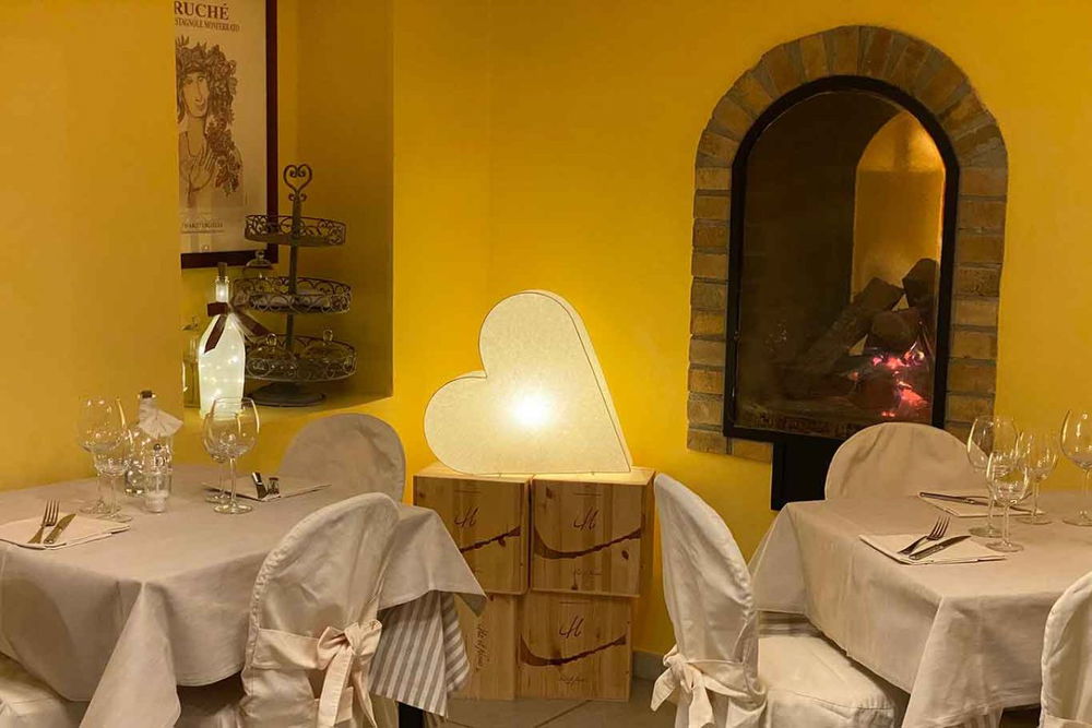 Il legame con il territorio si respira tanto nell’ambiente quanto nella cucina. L’interno della trattoria è elegante e confortevole, con un suggestivo caminetto che riscalda nei mesi invernali. In estate invece si pranza e si cena all’aria aperta, nella terrazza panoramica affacciata sulle colline o nel cortile interno.