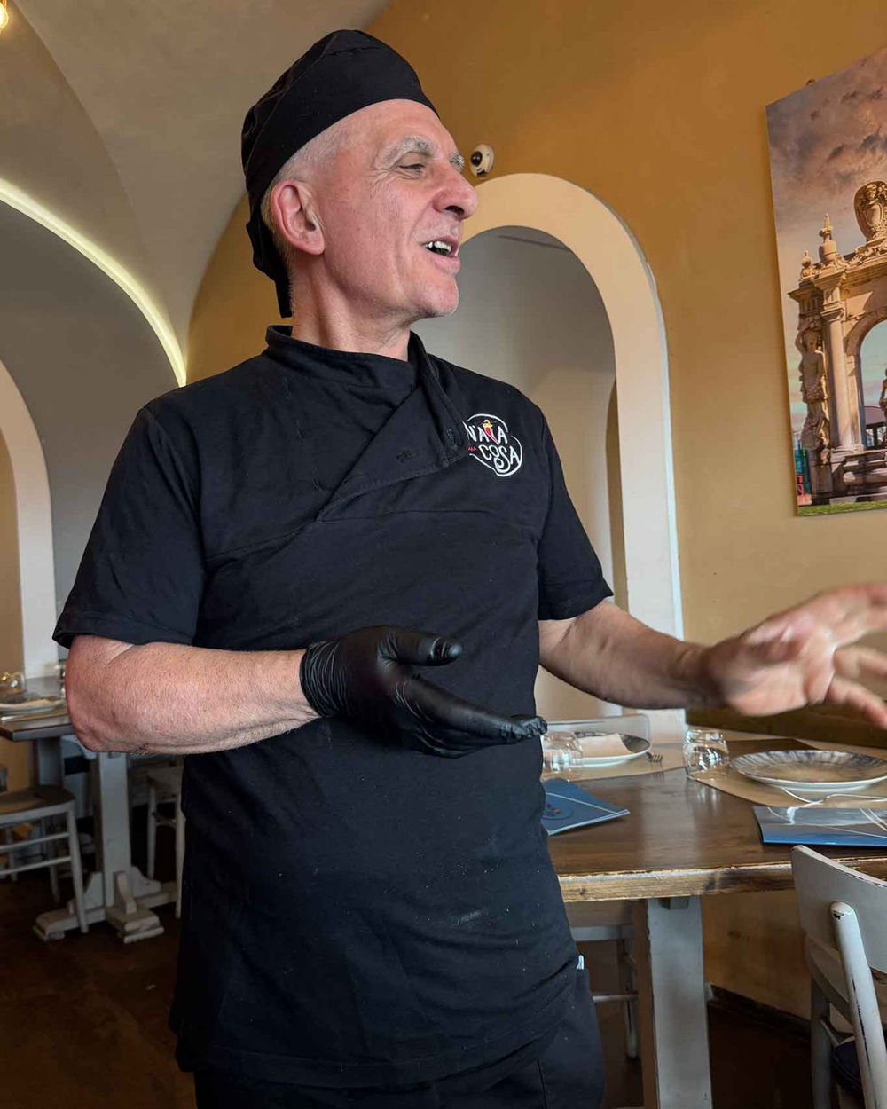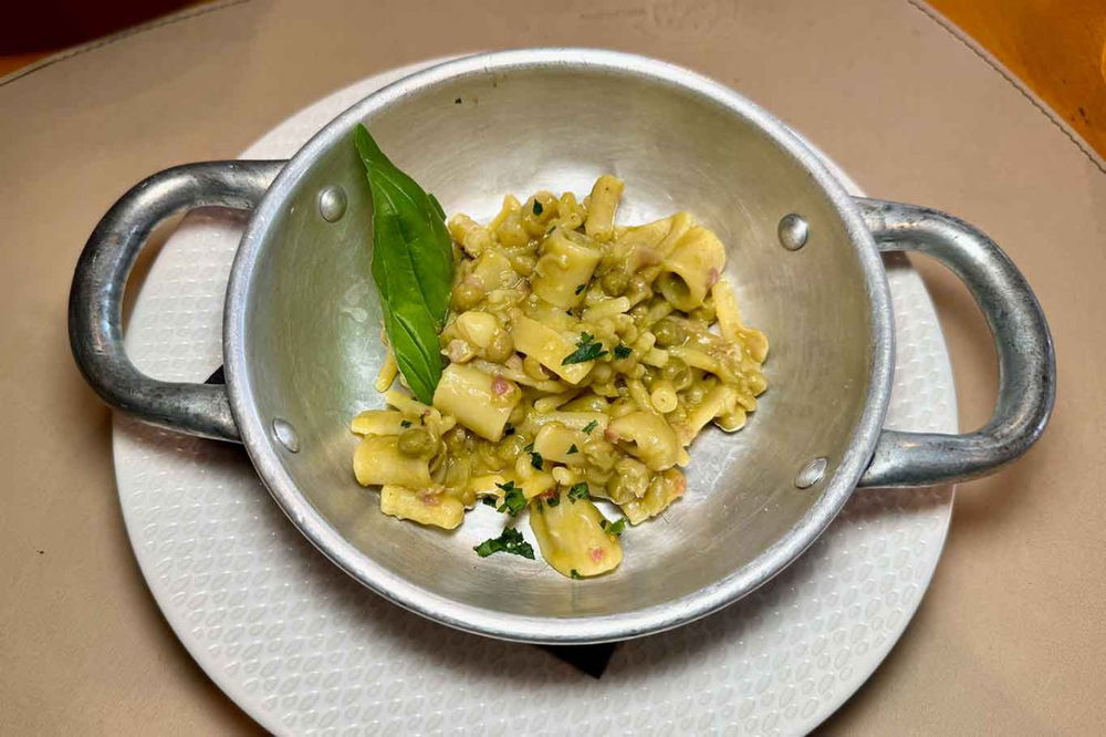 Ma in cucina da N’Ata Cosa c’è Giorgio Baiano, 30 anni di cucina da Ciro a Santa Brigida. Un nome, una garanzia con il micro assaggio di una pasta mista con piselli da capogiro. Buonissima.