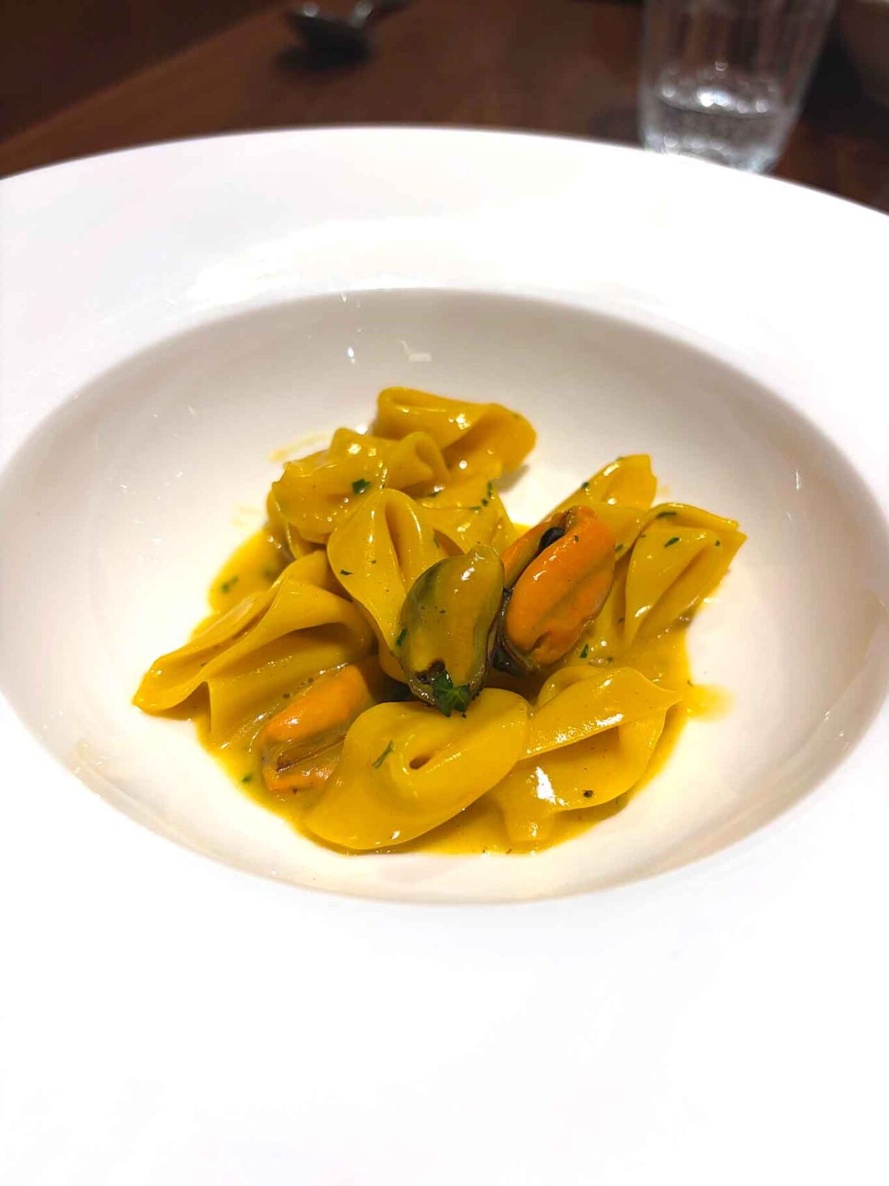 Sorpresine, cozze, burro acido e zafferano. Una pasta fresca semplice, quasi un leggero tortellino senza ripieno, con le cozze che si tuffano nello zafferano, legate da un burro soave. Ottimo piatto.