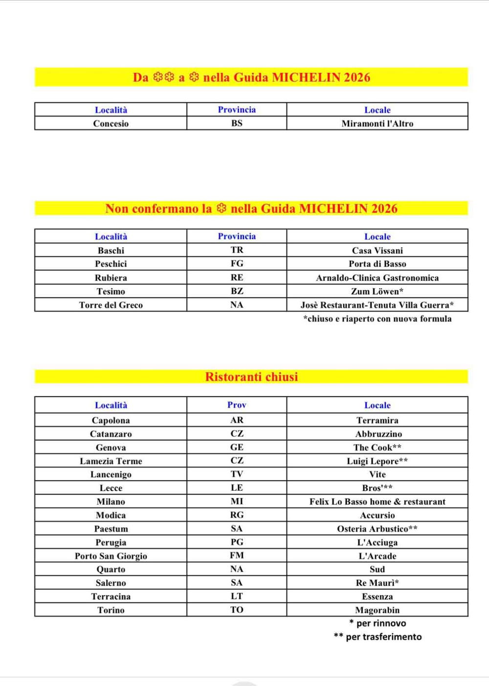 Numerose le chiusure e i trasferimenti che hanno determinato la perdita della stella Michelin nella Guida 2026.