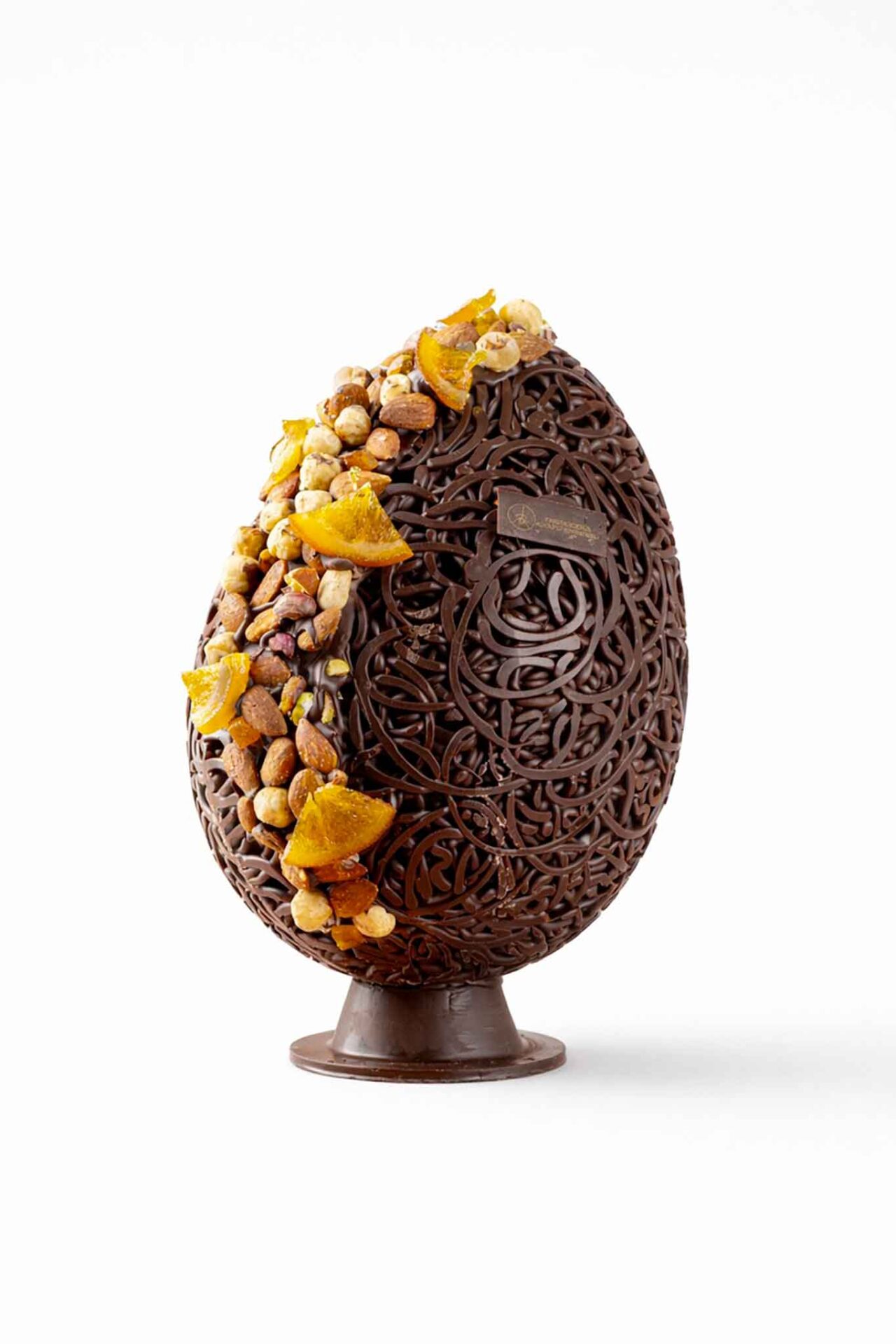 - Uovo Rocher Fondente: realizzato in finissimo cioccolato fondente ricoperto in superficie da croccanti bastoncini di mandorla pralinata;